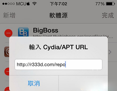 1. 首先你的設備必須是已越獄的 (查看越獄教程),先開啟 Cydia,點擊下方【管理】-【軟件源】-右上角【編輯】-左上角【添加】-添加新源地址http://r333d.com/repo-【添加源】,點擊這裡查看更多越獄免費源大全。