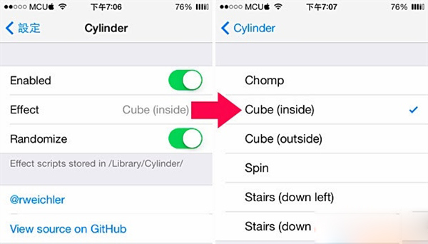 安裝重啟設備後,到“設置 > Cylinder > Effect”裡能選擇喜歡的翻頁特效。開啟“Randomize”的話,特效會以隨機方式出現。特效的 Scripts 路徑在“文件系統 / Library / Cylinder”裡,目前特效還不是很多,以後應該會慢慢加入。