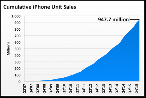 就在日前,蘋果公布的 2016 第二財季報告中,iPhone 的銷量又增加了 5119 萬部,如果將 iPhone 發布以來蘋果公布的銷量數字累積,截止 2016 年 3 月 26 日 iPhone 的銷量已經高達 9.47 億部。