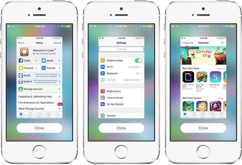 據介紹,安裝Popcorn後用戶將可以在任意一款應用上實現Peek預覽功能,在短按按壓應用圖標後將彈出小窗口,其中會顯示應用界面預覽,並且可以在這個窗口中對應用進行操作,點擊下方的“Close”或按Home鍵即可退出該界面。
