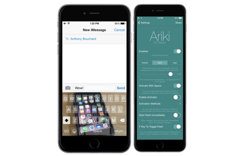 Ariki 是一款由開發者 iNasser 制作的付費插件,安裝並啟用後,即可讓自帶輸入法鍵盤界面變成“透明”的,就像 QQ 的“走路模式”那樣可以邊走邊聊(依然不建議這麼做)。在 Ariki 中開啟透明模式的默認方式為長按鍵盤“空格”鍵。