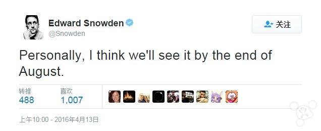 過了兩分鐘斯諾登補充道,他個人認為,我們最快將在 8 月底之前見到預言成真。FBI 一再強調自己無法破解這部 iPhone 5c,不過斯諾登認為這是一派胡言。