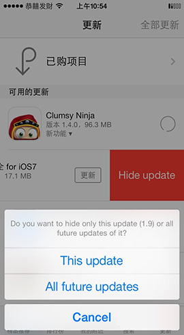 大家都知道在AppStore下載一個App之後,每當有版本更新,AppStore都會不斷發出更新提示,如果用戶既不想更新,又不希望 AppStore提示的話,這款《ASUpdateHider》可以讓你解決這個問題。安裝插件之後會在App更新列表中添加滑動隱藏功能,點擊選擇即 可隱藏更新提示。