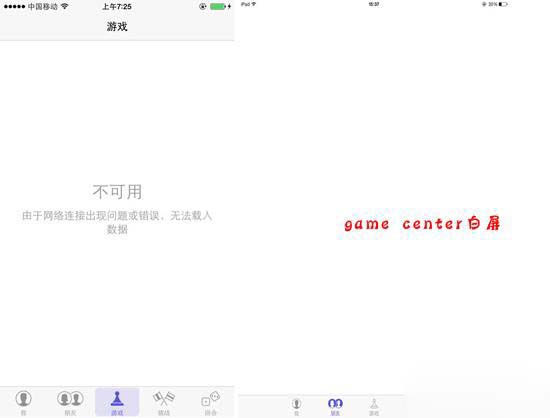 但是從iOS8一直到目前的iOS9.3.1,就有不少玩家發現自己的iOS設備在打開game center時會出現白屏以及服務器無法連接的現象。之所以會白屏是因為這其實是蘋果iOS系統的一個BUG,當然有時候也有網絡的因素。