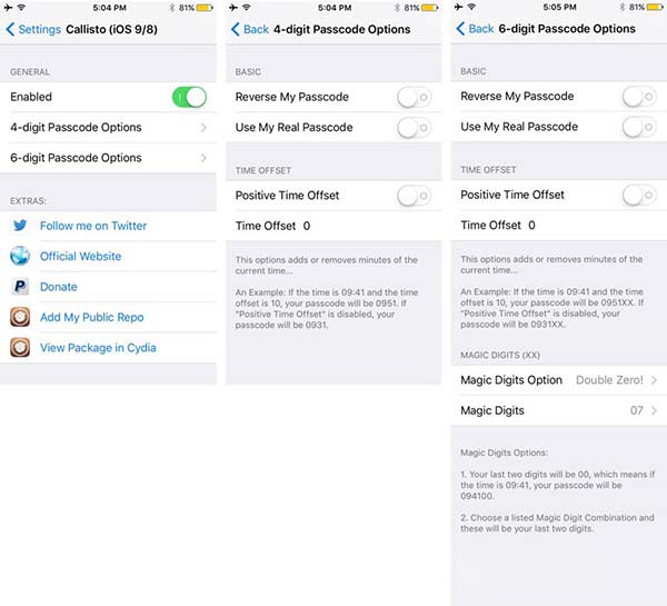 之前曾有一款名為“TimePasscode”的插件允許用戶將iOS設備的鎖屏密碼設置成與時間同步的數字,不過大多都不支持新增6位數字密碼功能的iOS9,最近在BigBoss源一款名為“Callisto”的新插件發布了,功能更豐富。