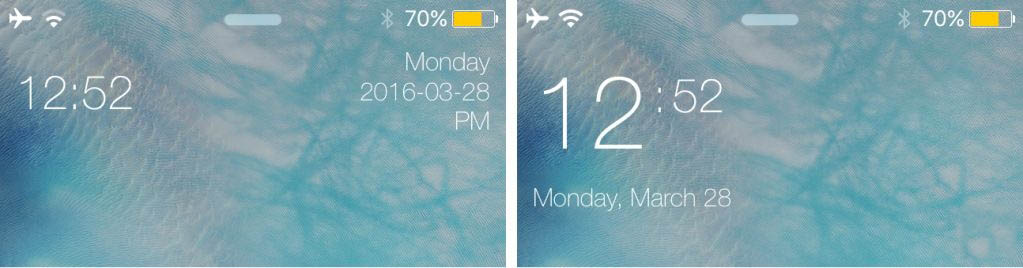 另一種選擇是“MIUI Style”,相信國內用戶對這個詞不會感到陌生,使用這個外觀選擇後 iOS 的鎖屏時間將被移到左上角,並改為時鐘大、分鐘小的樣式,日期位於時間下方,類似最新版本的 MIUI。