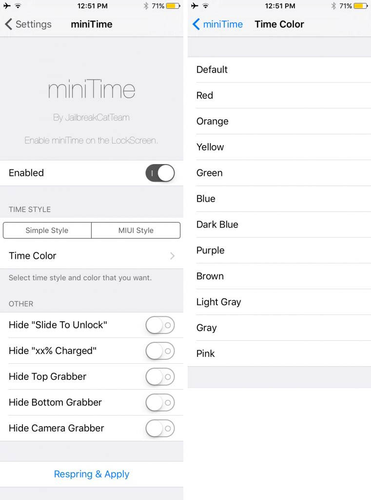 同時,利用 miniTime 可以改變時間和日期的顏色,共有 11 種預設顏色。在 miniTime 中設置好想要的時間、日期外觀後,需要注銷設備一遍使改變生效。安裝 miniTime 後,會在系統設置中出現對應條目,插件還提供啟用開關、隱藏“滑動以解鎖”/電量百分比/相機快捷方式等選項。點擊這裡查看更多越獄免費源大全。