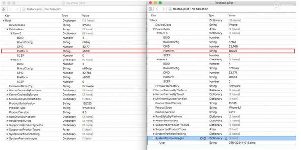 近日有開發者對 iPhone SE 的相關文件進行了分析,正如下圖所示,和 iPhone 6s/6s Plus 一樣在“Platform”一欄有不同的參數,分別為“s8003”和“s8000”,這意味著 iPhone SE 的 A9 芯片極有可能也分兩種版本。