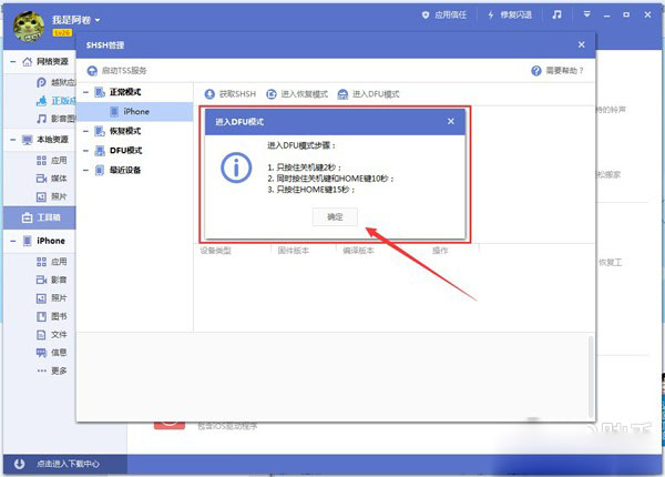 1、打開iTunes,斷開iOS設備與電腦的連接。長按【Home鍵】+【電源鍵】8秒強制關機 -- 關機後長按【Home鍵】鍵8秒--通過USB數據線連接電腦,或者請把設備鏈接電腦,先按住【電源鍵】2~3秒,然後繼續同時按住【電源鍵】和【Home鍵】,持續到第10秒的時候,請立即松開【電源鍵】,並繼續保持按住【Home鍵】,直到在電腦上看到識別到DFU狀態下的USB設備時就進入到DFU模式了,這個時候iTunes會自動或者手動啟動。