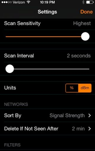 WiFi Explorer主界面分為上下兩部分,上部分為掃描網絡集中顯示區域,下方為已掃描網絡波狀信息顯示區域。