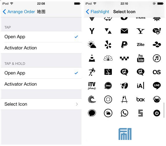另外,點擊每一個 App 項目之後都可以看到進一步的操作設置,可以定制每個已選App單擊和長按圖標所能激活的Activator動作,不過需要注意的是,在選擇 Activator 動作時有可能會出現閃退的情況。此外,在這裡還能夠給 App 選擇自己心儀圖標,300 多種總有一個你喜歡的吧。