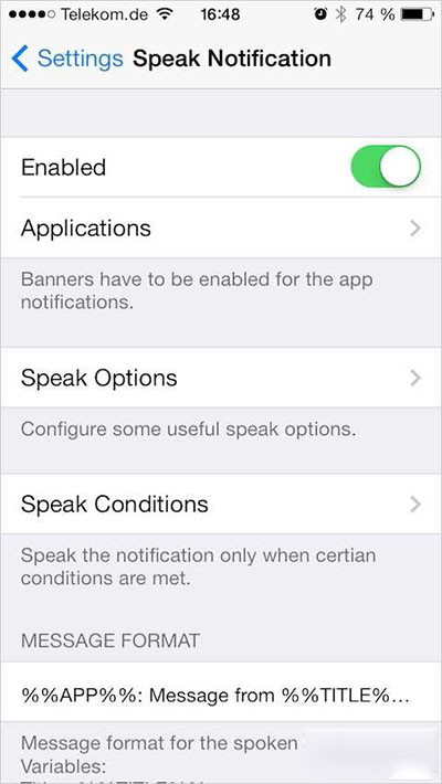 這是一款新上架的插件,兼容任何iOS 7設備。Speak Notification不需要啟用Siri語音,但要求打開橫幅通知,不然閱讀功能無法生效。有需要的用戶可從Cydia購買,價格為1.49美元,點擊這裡查看更多越獄免費源大全。