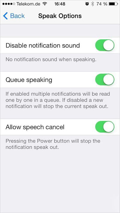 安裝Speak Notification後,你可以用它來閱讀短信、郵件,更細的還可以閱讀游戲中心發來的邀請,總之推送通知都能給你讀出來,不必你點擊屏幕。