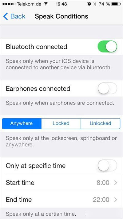 如果你擔心隱私問題,你大可自定義Speak Notification的閱讀規律,比如只有連接藍牙或耳機的時候(適合開車族)、在特定時間閱讀、只閱讀某個應用的通知。你也可以設置當iPhone連接音響的時候禁用閱讀,免得遇到尴尬。如果有旁人在場不小心閱讀了一條非常隱私的通知時怎麼辦呢?趕緊在第一時間按下開/關機鍵,可以立即停止閱讀,反應可要迅速。