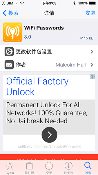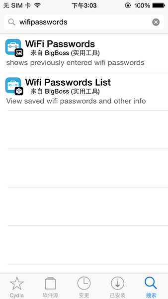 ①打開【Cydia】-選擇【搜索】-輸入【WifipassWords】