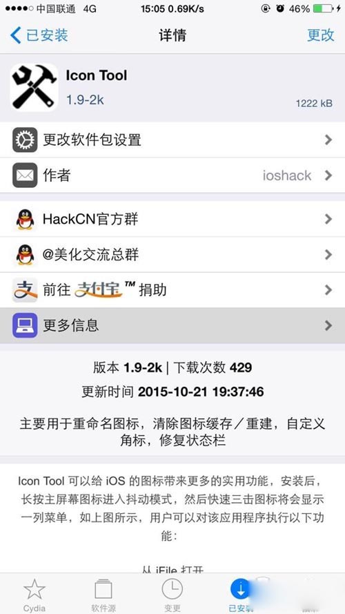 1、設備越獄後打開Cydia應用商店,搜索安裝Icon Tool插件(安裝完成後不會有任何圖標)。