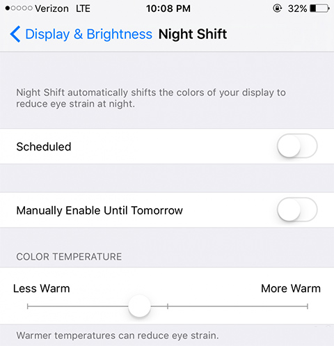 另外在設置-顯示與亮度-Night Shift中新增了“Manually Enable Until Tomorrow”的選項,如果選擇了該選項,Night Shift就會在下一天的日出或是特定時間開啟。另外的變動還包括色溫滑動條,分別分為“Less Warm”(偏冷)和“More Warm”(較暖)。