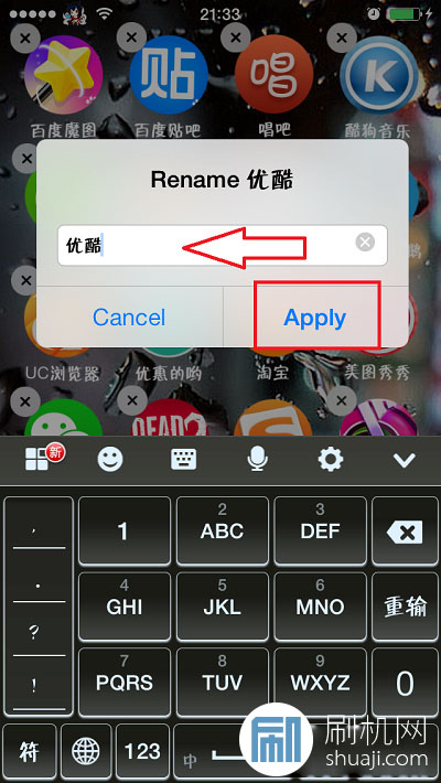 5:抖動後雙擊想改名字的APP如優酷,彈出改動窗口輸入你想要的名字。