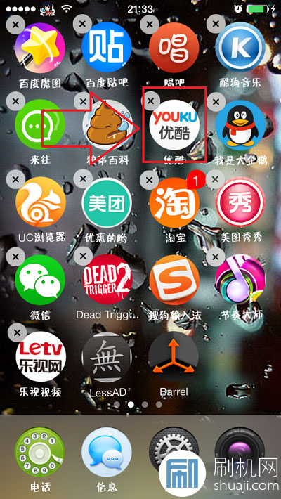 4:開啟後回到桌面,找到一個APP,我們以優酷為例:長按APP至抖動狀態。