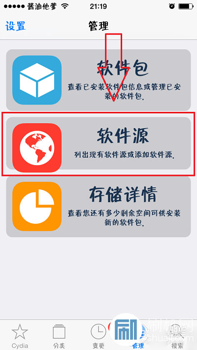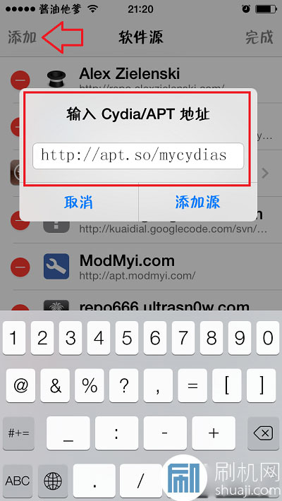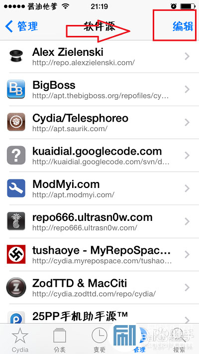 1:如圖所示:進入Cydia-管理-軟件源-編輯-添加-輸入:http://apt.so/mycydias。