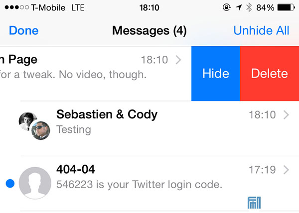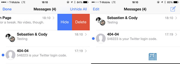 HiddenConvos是一款幫助用戶快速隱藏信息應用內對話的插件,用戶只需一個向左輕掃的手勢即可隱藏。用戶在一個對話上向左輕掃,然後點擊Hide按鍵即可以隱藏對話,控制該對話的通知推送。