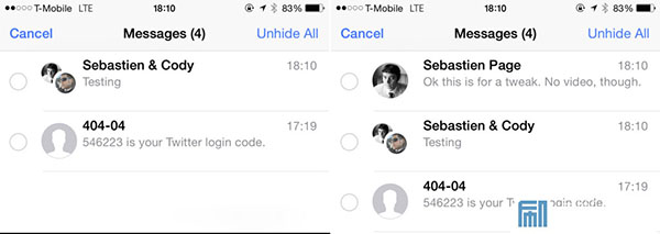 安裝該插件之後,用戶無需進行任何設置即可使用。如下圖就是用戶輕掃、點擊隱藏按鍵之後的效果,它讓對話進入勿擾模式。如果你想讓對話重新出現在信息應用中,點擊左上角的編輯按鍵,然後點擊右上角的Unhide All按鍵即可。