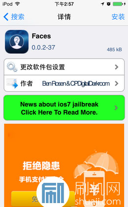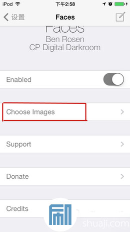 Faces 是一款免費小插件,可以在 Cydia 的 BigBoss 中搜索到,支持 iOS 7.0.4 到 7.1.2 系統。安裝重啟之後顯示在設置項中。這款插件的設置功能主要看下面三項就好:①啟用/禁用開關,②圖片選項,③重啟設備,別的就是設計者介紹和支持了。