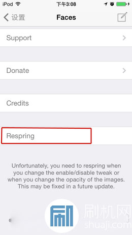 設置到這裡步驟基本上就結束了,不過插件到現在還不能生效,每次變更圖片以及不透明度設置之後,都必須撤銷一次才會出現效果。用戶只要退到插件設置主頁點擊最下面的 Respring 就大功告成了。