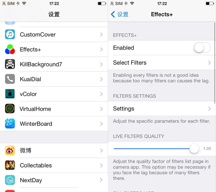 眾所周知,蘋果ios7系統給iphone拍照帶來了全新的體驗,我們可以實時選擇喜歡的濾鏡進行拍攝。無奈官方給出的濾鏡效果並不算多,而Effects+這正好彌補了這一點。如果你是一個拍攝的發燒友,也想要更多效果的濾鏡,那麼,一款可支持擴展自帶拍照應用濾鏡功能的插件Effects+便是專屬你的福音。[iOS7.o.x越獄適用]