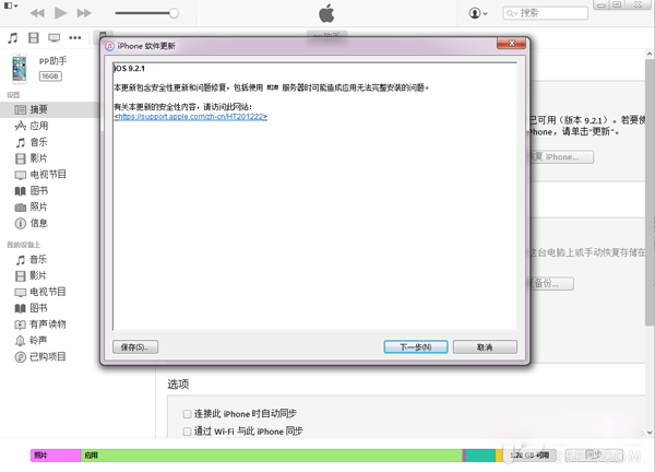 2、設備連接至iTunes,進入設備界面,點擊【更新】,等待iTunes下載最新版iOS9.2.1並進行自動更新升級即可。