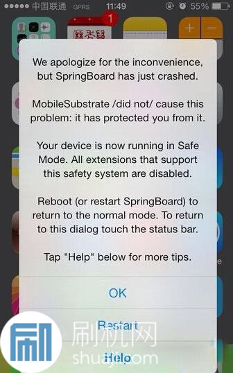 出現SafeMode前,大多數情況是您剛安裝完一個Cydia插件,突然的屏幕出現菊花圈,然後,就SafeMode了。屏幕會顯示:We apologize for the inconvenience,but SpringBoard has just crashed. MobileSubstrate did not cause this problem:it has protected you from it.