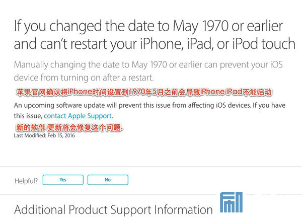 蘋果官網今天確認了最近影響甚廣的iPhone時間設置到1970年1月1日會變磚的問題,並承諾會在下一個軟件更新中修復,目前我們還不知道蘋果會不會專門針對這一BUG推送iOS9.2.2更新,還是直接在iOS9.3中解決這一問題。
