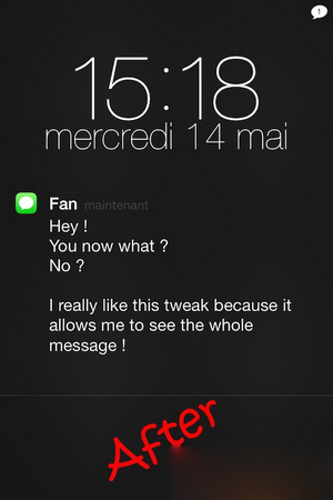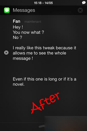 每次來信息,在鎖屏和通知中心只顯示一部分,每次查看總是要解鎖屏幕,再打開短信應用進行查看短信內容,頗為繁瑣。今天推薦一款簡易插件Longer Message,它可以讓鎖屏與通知中心上的短信顯示更多行數,你可以輕松獲取全部短信內容,而無需點擊打開查看。