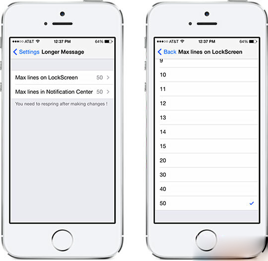 安裝完成後進入設置,你可對【Longer Message】進行設置,在這裡你可以分別設置鎖屏與通知中心顯示短信內容的行數。