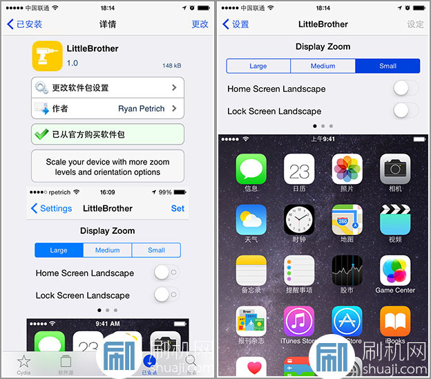 我們此前曾為大家介紹過一款名為Rotate+的插件,是可以讓舊設備也能體驗新款iPhone6plus的橫屏顯示模式,而越獄社區最新推出的一款插件LittleBrother,除了能讓iPhone6/iPhone5s等設備支持橫屏模式外,另提供了三種縮放比例供用戶選擇。