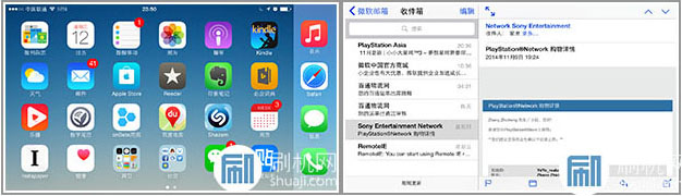 為了更好地去利用iPhone6Plus 那塊5.5英寸的大屏幕,蘋果為它植入了類似平板的橫屏模式,其中部分內置的預裝應用具有橫屏顯示模式以及分欄式的界面布局。
