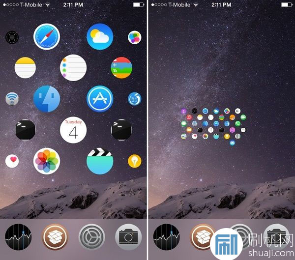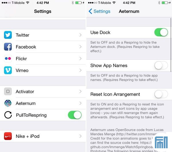 首先是dock欄,你可以在插件的設置面板中輕松開啟或者關閉dock欄。對於有些用戶來說,dock欄是很重要的。其次,你可以重新整理應用圖標,這對於一些強迫症的用戶來說尤為重要。最後也是最重要的就是啟動應用和動畫的流暢性,因為在iOS中要經常切換應用,所以流暢性非常重要。