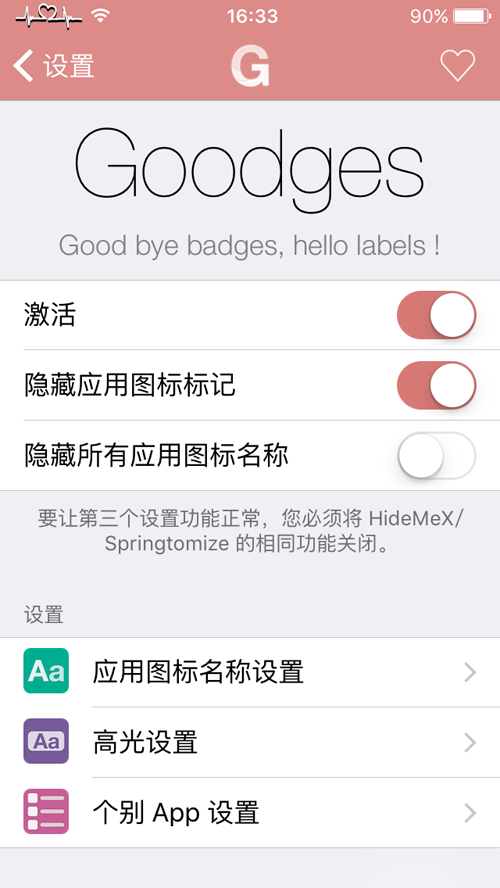 應用角標(包括App Store更新提醒、應用通知)時常會讓人感到心煩,特別是對強迫症患者來說更是如此。我們此前為大家介紹了iOS9.1/9.2不越獄消除應用角標的方法【教程】,雖然操作也不麻煩,但越獄後安裝插件關閉應用角標顯然更加簡單快捷。下面小編就為你介紹一款簡單實用的去角標插件——goodges。