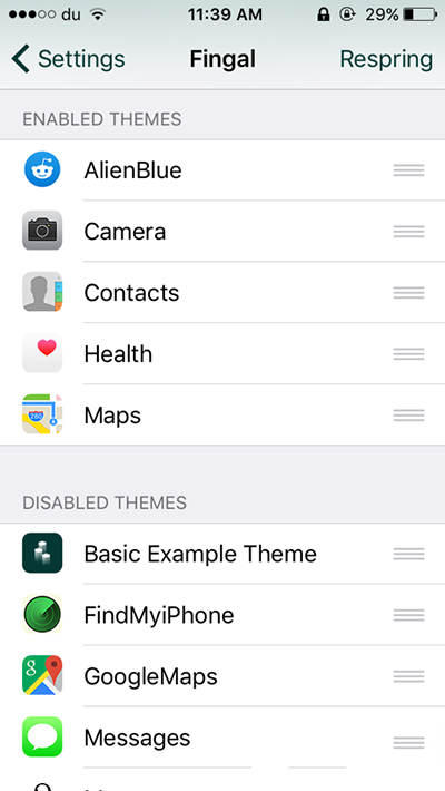 當你第一次安裝這款插件,Fingal 會自帶一個名為“Basic Example Theme”的主題(需自行啟用),該主題將會為4個原生圖標帶來動畫效果,分別是信息、提醒事項、設置和Safari。啟用主題後需要注銷設備,效果才會生效。