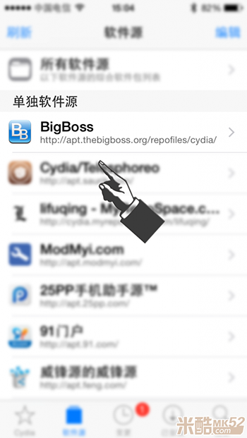 2、打開Cydia - 添加Bigboss源(一般都自帶的不用添加)。