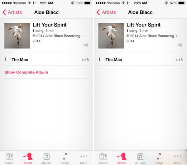 現在打開你的 iOS 設備上的“音樂”應用程序,轉到“專輯”視圖下,你會發現一個“顯示完整專輯”( Show Complete Album )按鈕,點擊這個按鈕你就可以直接在此頁面通過 iTunes 購買專輯內的其他歌曲。算是購買歌曲的一個快捷鍵吧。