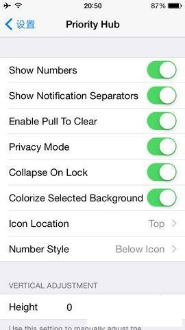 用戶可以對插件進行相應的修改,例如應用程序圖標的顯示位置,推送消息的數目,以及顯示的風格用戶都可以依據自己的喜愛進行設置,如果你正為通知中心提醒太雜亂而抓狂的話,不妨去BigBoss源中下載這款Priority Hub插件,支持iOS7-iOS9,想要入手的朋友趕緊去安裝吧。