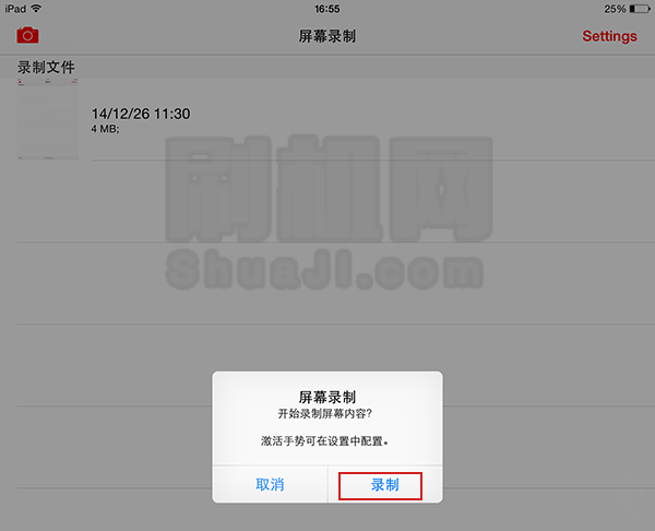 安裝DisplayRecorder之後,會在主屏上生成一個程序圖標,點擊進入,就能夠看到開始錄制的界面。點擊左上角的【相機】圖標就可以開始錄制了。