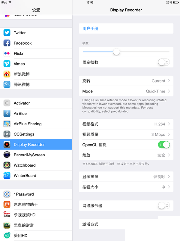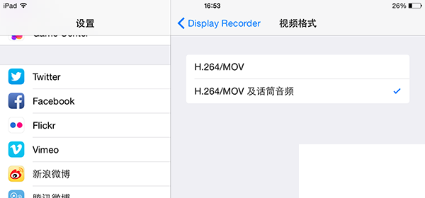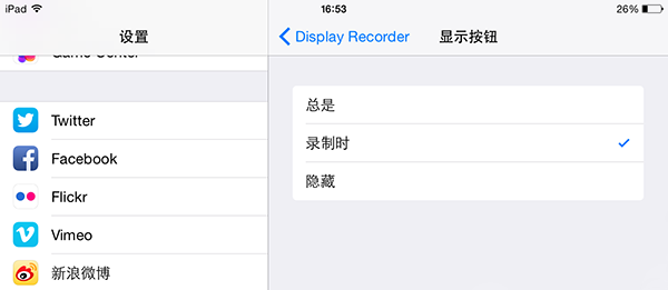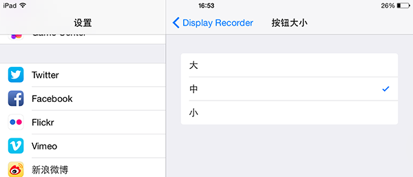 Display Recorder點擊右上角的【Setting】,就可以進入到設置界面,這裡你就可以個性化設置你錄屏的需要,值得興奮的是,DisplayRecorder設置已經是漢化版了,用戶們設置起來就非常直觀。