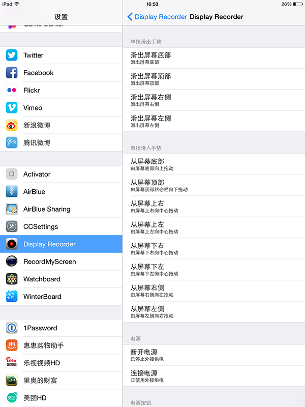 進入【激活手式】即可選擇采用什麼樣的手勢激活,這裡小編要重點說一下,如果你安裝的BigBoss源上的正版插件,即能夠順利設置手勢激活DisplayRecorder,如果你是在其它源安裝免費盜版的話,則無法開啟這個功能。