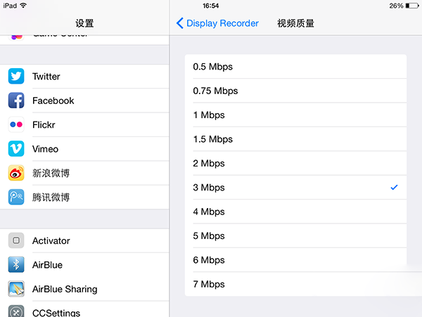 進入【視頻質量】即可選擇錄制視頻的清晰度。如果你只是錄制在設置上看看,用默認的3Mbps足夠用了,如果你需要錄制高清游戲視頻,並上傳到視頻網站上去,則可以選擇更為高清的選項。