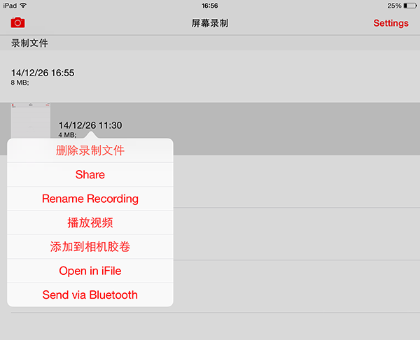 錄制完後,視頻則自動存儲在DisplayRecorder應用上。點擊所錄制的視頻,即進入以下界面,你可以選擇將它刪除、分享、重錄、播放、選擇【分享】,你能夠將視頻迅速分享到信息或是郵件中。選擇【添加到相機膠卷中】,就可以到相冊中直接打開你所錄下的視頻。點擊【Open in iFile】就能夠在iFile中然後選擇某款播放器打開它,就和電腦上的我的電腦中打開文件性質一樣,如果你安裝一個名為【AirBlue Sharing】的插件,所錄下的視頻還能夠用藍牙發送出去。非常方便。
