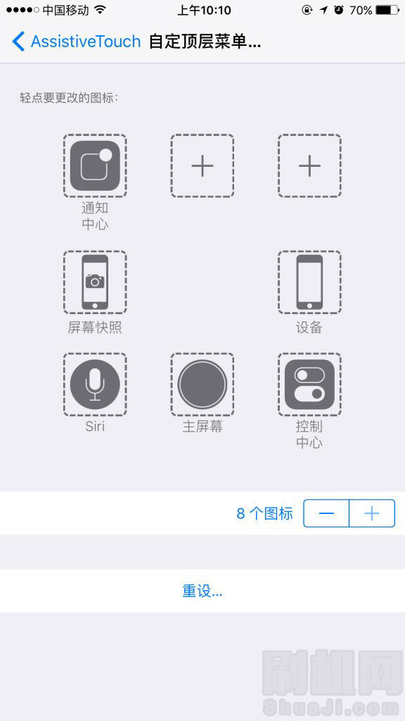 二、在“設置-通用-輔助功能-AssistiveTouch”的路徑下,小圓點也得到了更新,在自定頂層菜單中,圖標的數量從原來的6個變成了8個。對於習慣啟用小圓點的網友來說,這項更新還是非常不錯的。