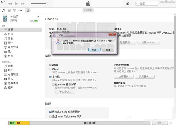 3、設備連接iTunes,按住鍵盤上的Shift鍵(Mac系統上按住alt鍵),鼠標點擊“恢復iPhone”,選擇已下載好的iOS9.2.1/9.2固件,確認恢復之後等待iTunes自動運行完成即可。