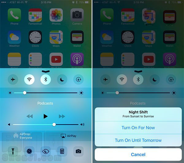 在iOS9.3 Beta1版本中,蘋果曾推出了一個名為“夜班”(Night Shift)的新功能,會基於你的iPhone或者iPad的時間和位置略微改變屏幕的色溫。在最新版本中,蘋果將該功能加入到控制中心,大家可以直接通過下拉菜單操作。
